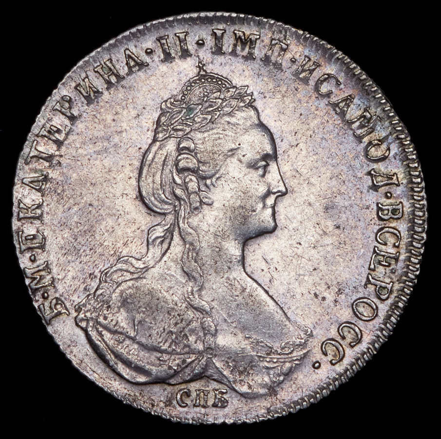 В центре профильный портрет вправо императрицы Екатерины II. Вокруг портрета круговая надпись: «Б•М•ЕКАТЕРИНА•II•IМП•ИСАМОД•ВСЕРОСС•». Под портретом буквы «С П Б», обозначение Санкт-Петербургского монетного двора. По окружности канта имеются рельефные элементы, выполненные в виде зубцов.