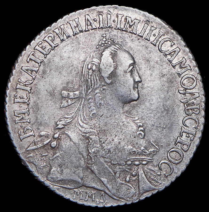 В центре профильный портрет вправо императрицы Екатерины II. Вокруг портрета круговая надпись: «Б•М•ЕКАТЕРИНА•II•IМП•IСАМОД•ВСЕРОС». Под портретом буквы «М М Д», обозначение Московского монетного двора.