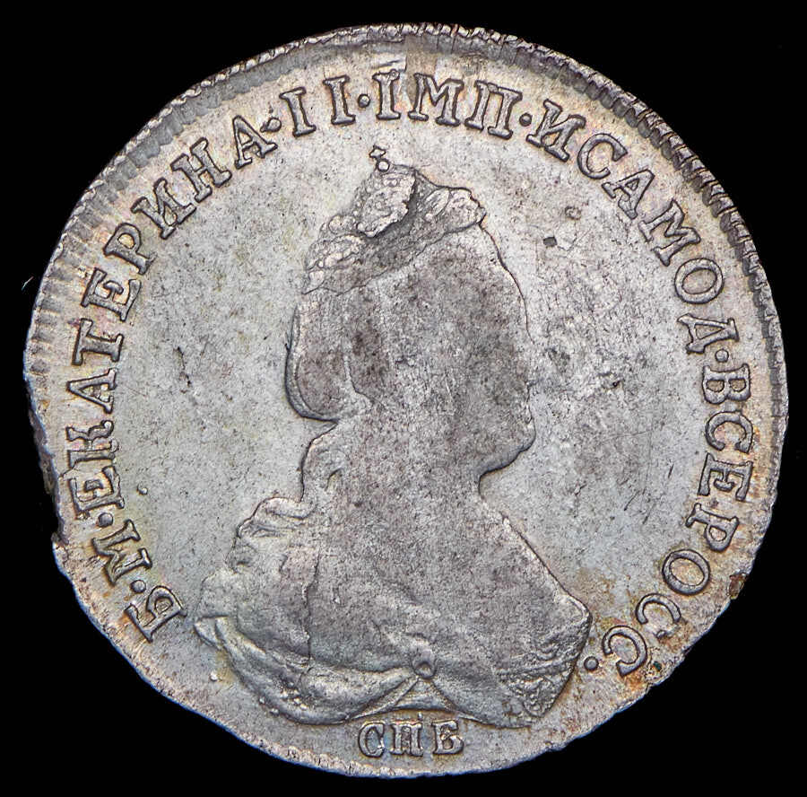 В центре профильный портрет вправо императрицы Екатерины II. Вокруг портрета круговая надпись: «Б•М•ЕКАТЕРИНА•II•IМП•ИСАМОД•ВСЕРОСС•». Под портретом буквы «С П Б», обозначение Санкт-Петербургского монетного двора. По окружности канта имеются рельефные элементы, выполненные в виде зубцов.