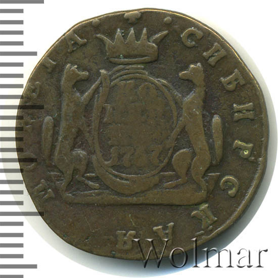 В центре изображен картуш с надписью в три строки: «КО»│«ПЕИ»│«КА•», под надписью дата выпуска - «1767». Картуш, с обеих сторон, поддерживается двумя соболями. Над картушем - царская корона, над ней - четырёхлистная цветочная розетка. По окружности, вдоль канта, надпись: «•СИБИРСКАЯ•МОНЕТА•».