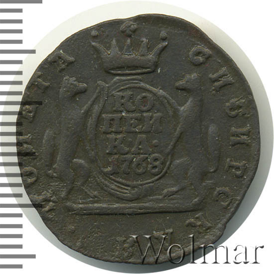 В центре изображен картуш с надписью в три строки: «КО»│«ПЕИ»│«КА•», под надписью дата выпуска - «1768». Картуш, с обеих сторон, поддерживается двумя соболями. Над картушем - царская корона, над ней - четырёхлистная цветочная розетка. По окружности, вдоль канта, надпись: «•СИБИРСКАЯ•МОНЕТА•».