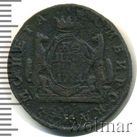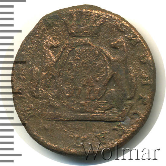 В центре - вензель Екатерины II. Над ним императорская корона. Под вензелем обозначение Сузунского монетного двора - буквы «К М». Вокруг центрального изображения, вдоль канта, изображён венок из лавровой и пальмовой ветвей, которые, в нижней части, перевязаны лентой на узел бантом.