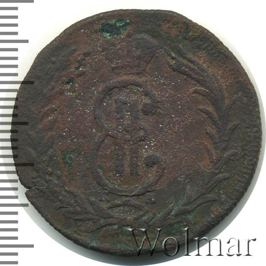 В центре - вензель Екатерины II. Над ним императорская корона. Под вензелем обозначение Сузунского монетного двора - буквы «К М». Вокруг центрального изображения, вдоль канта, изображён венок из лавровой и пальмовой ветвей, которые, в нижней части, перевязаны лентой на узел бантом.