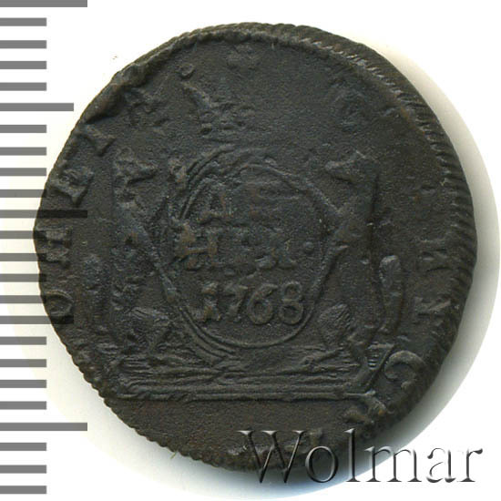 В центре изображен картуш с надписью в две строки: «ДЕ»│«НГА•», под надписью дата выпуска - «1768». Картуш, с обеих сторон, поддерживается двумя соболями. Над картушем - царская корона, над ней - четырёхлистная цветочная розетка. По окружности, вдоль канта, надпись: «•СИБИРСКАЯ•МОНЕТА•».