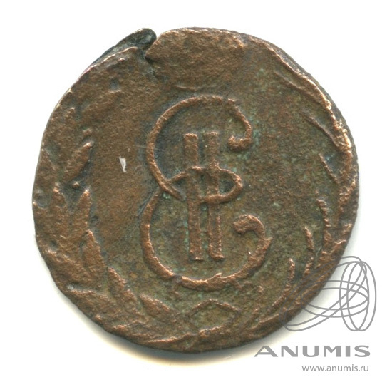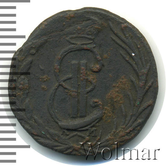 В центре - вензель Екатерины II. Над ним императорская корона. Под вензелем обозначение Сузунского монетного двора - буквы «К М». Вокруг центрального изображения, вдоль канта, изображён венок из лавровой и пальмовой ветвей, которые, в нижней части, перевязаны лентой на узел бантом.