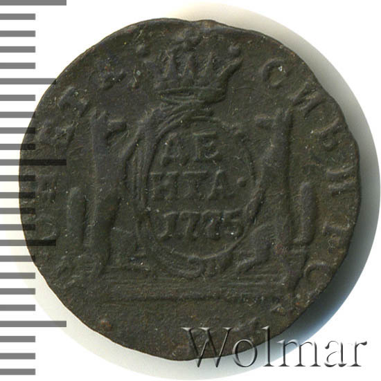 В центре изображен картуш с надписью в две строки: «ДЕ»│«НГА•», под надписью дата выпуска - «1775». Картуш, с обеих сторон, поддерживается двумя соболями. Над картушем - царская корона, над ней - четырёхлистная цветочная розетка. По окружности, вдоль канта, надпись: «•СИБИРСКАЯ•МОНЕТА•».