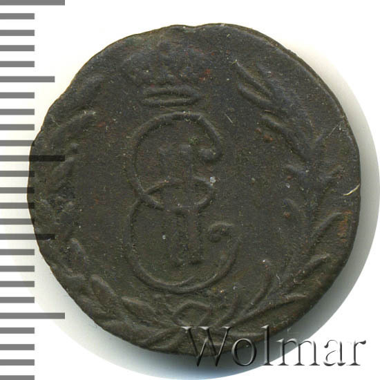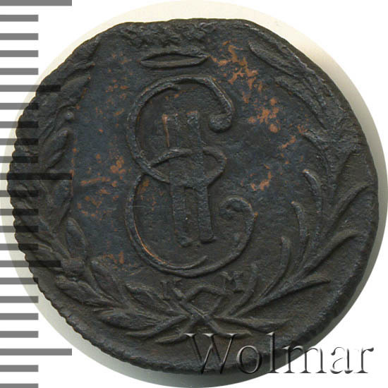 В центре - вензель Екатерины II. Над ним императорская корона. Под вензелем обозначение Сузунского монетного двора - буквы «К М». Вокруг центрального изображения, вдоль канта, изображён венок из лавровой и пальмовой ветвей, которые, в нижней части, перевязаны лентой на узел бантом.
