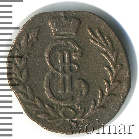В центре - вензель Екатерины II. Над ним императорская корона. Под вензелем обозначение Сузунского монетного двора - буквы «К М». Вокруг центрального изображения, вдоль канта, изображён венок из лавровой и пальмовой ветвей, которые, в нижней части, перевязаны лентой на узел бантом.