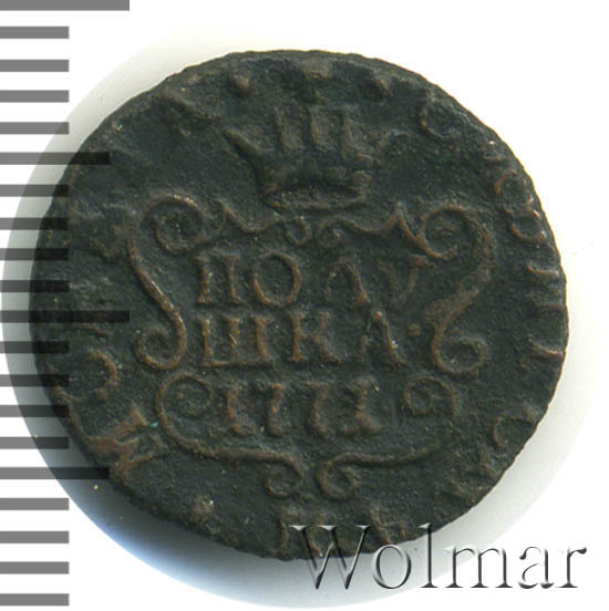 В центре изображен картуш с надписью в две строки: «ПОЛУ»│«ШКА•», под надписью дата выпуска - «1771». Над картушем - царская корона, над ней - четырёхлистная цветочная розетка. По окружности, вдоль канта, надпись: «•СИБИРСКАЯ•МОНЕТА•».