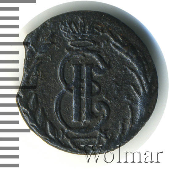 В центре - вензель Екатерины II. Над ним императорская корона. Под вензелем обозначение Сузунского монетного двора - буквы «К М». Вокруг центрального изображения, вдоль канта, изображён венок из лавровой и пальмовой ветвей, которые, в нижней части, перевязаны лентой на узел бантом.