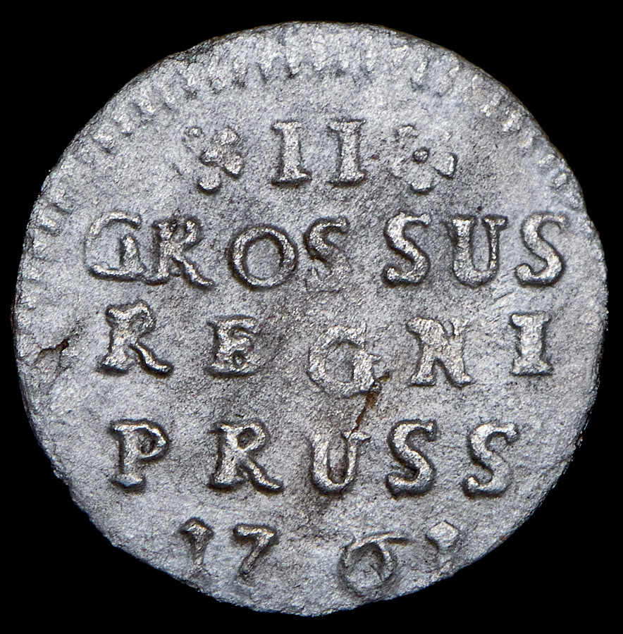 Надпись в пять строк: «II»│«GROSSUS»│«REGNI»│«PRUSS»│«17 61». Цифра номинала «II» ограничена с обеих сторон цветочными розетками.