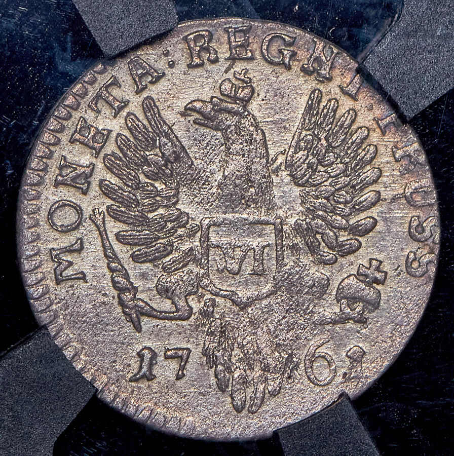 6 грошей — Для Пруссии — Отслойки. Редка в подобной сохранности 1761 1761 года -буквы - Аукцион: Anumis Состояние: AU-XF | 11.01.2022 |