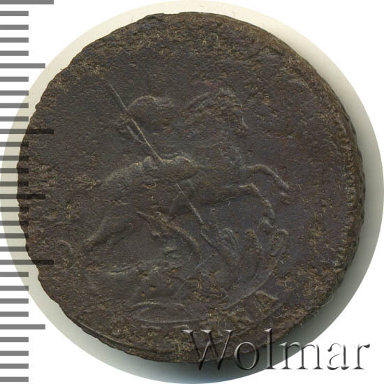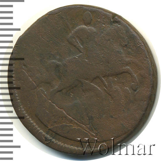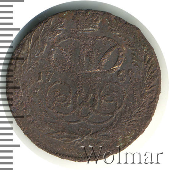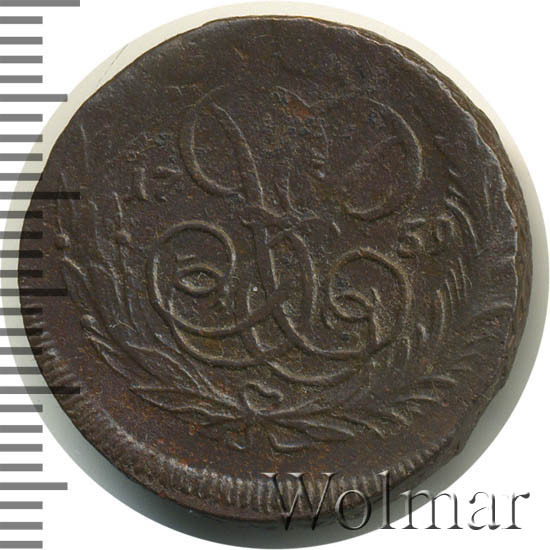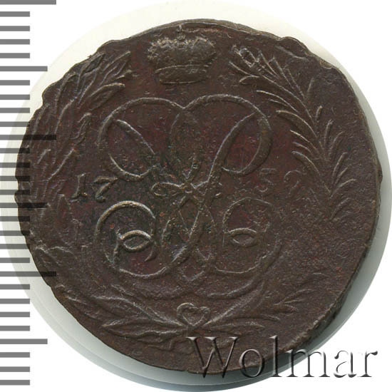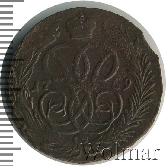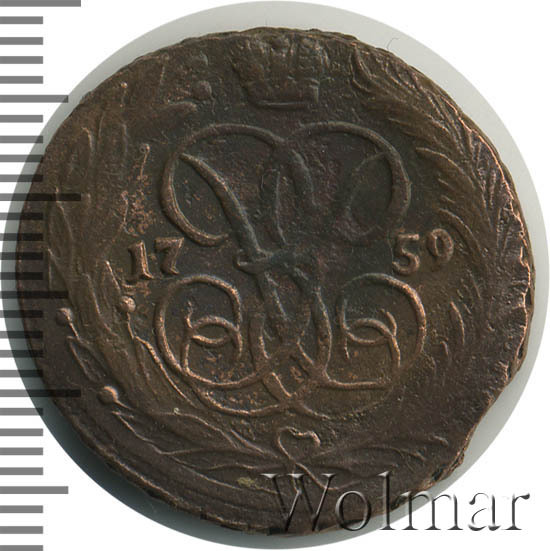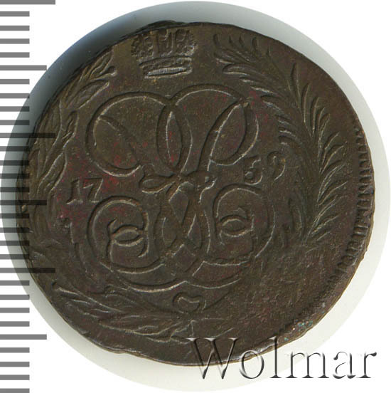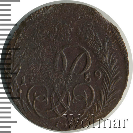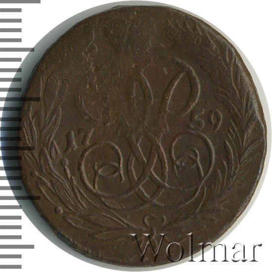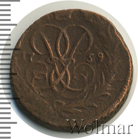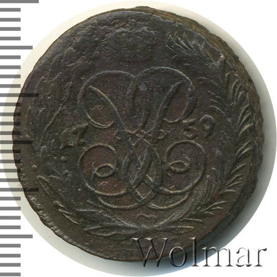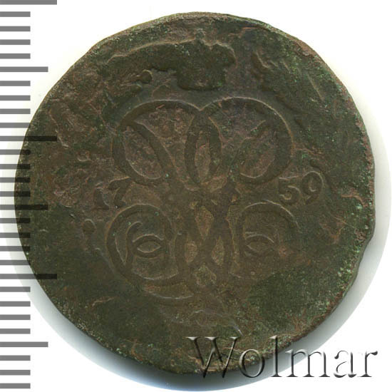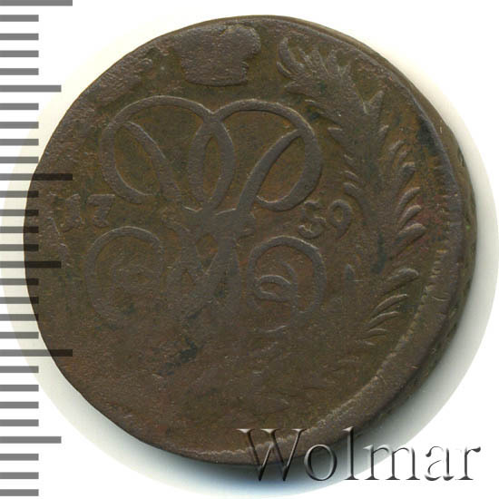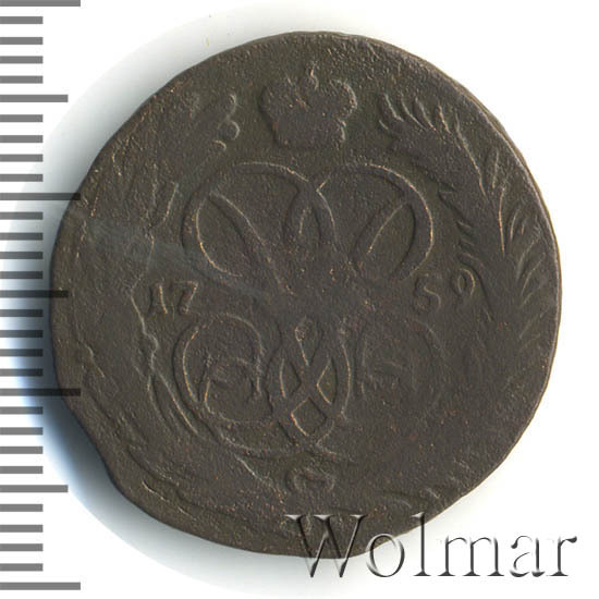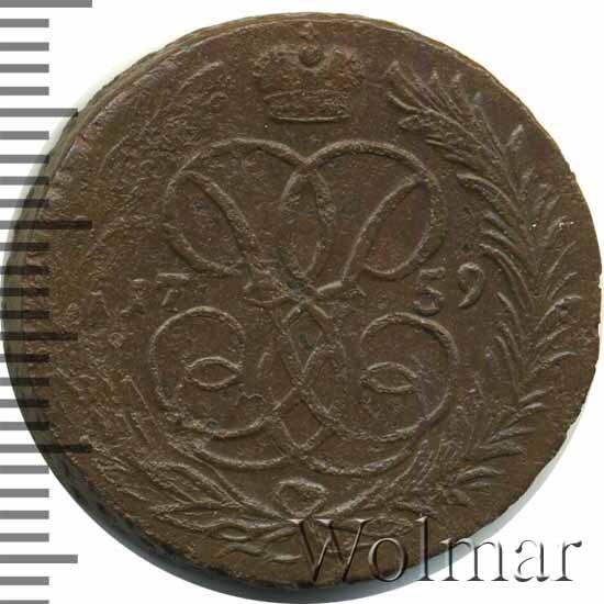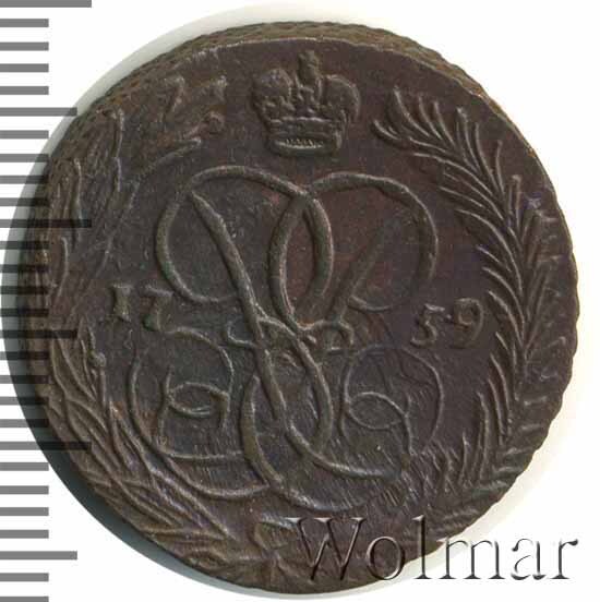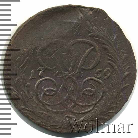 В центре изображён вензель императрицы Елизаветы I (Петровны). Над вензелем - императорская корона. По обеим сторонам от вензеля цифры даты выпуска монеты: слева - «17», справа - «59» (1759 год). Вокруг центрального изображения, вдоль канта, изображён венок из лавровой и пальмовой ветвей, которые, в нижней части, перевязаны лентой на узел бантом.