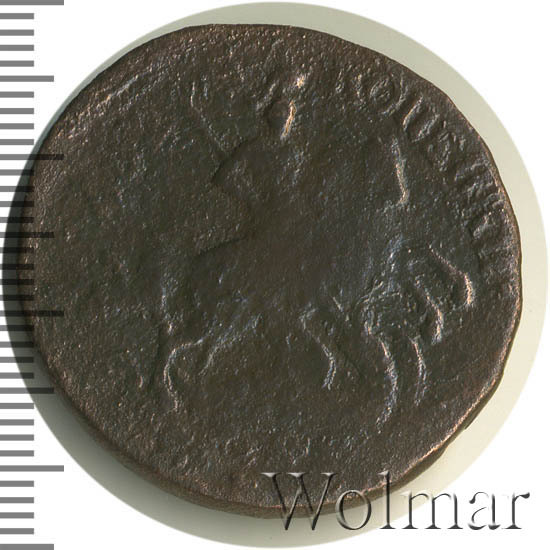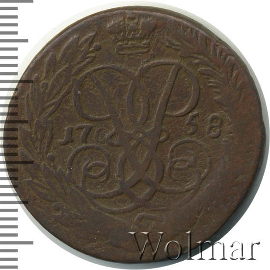 В центре изображён вензель императрицы Елизаветы I (Петровны). Над вензелем - императорская корона. По обеим сторонам от вензеля цифры даты выпуска монеты: слева - «17», справа - «58» (1758 год). Вокруг центрального изображения, вдоль канта, изображён венок из лавровой и пальмовой ветвей, которые, в нижней части, перевязаны лентой на узел бантом.