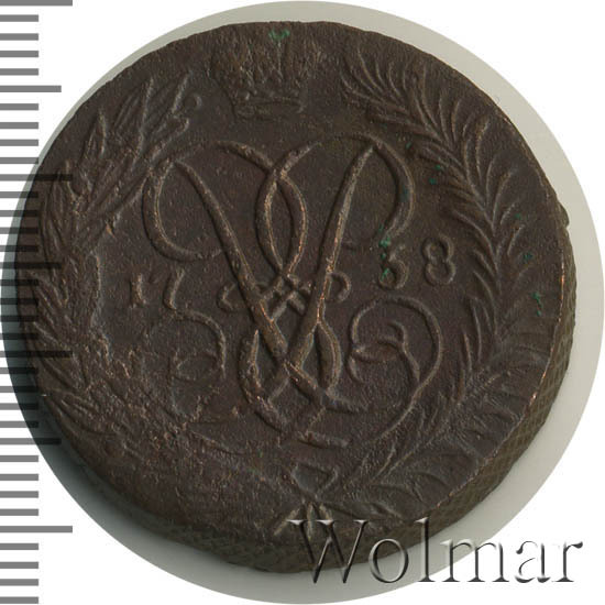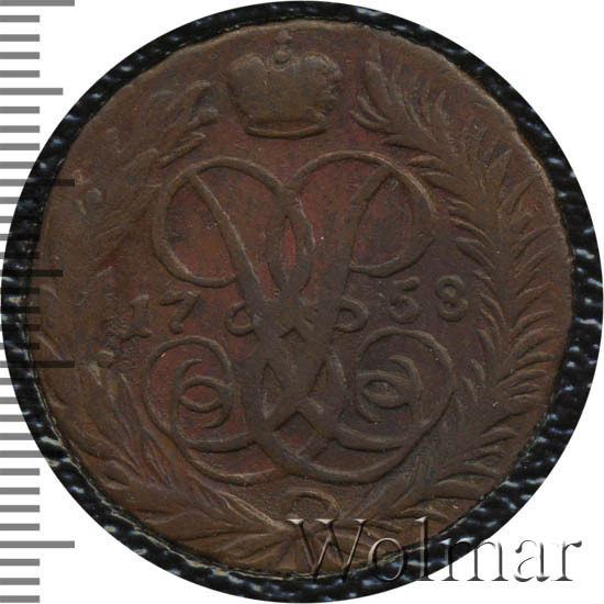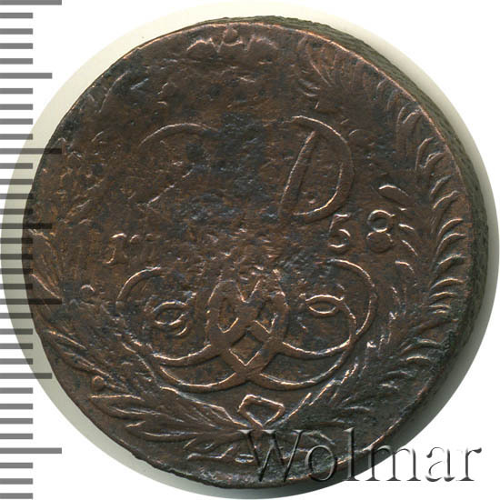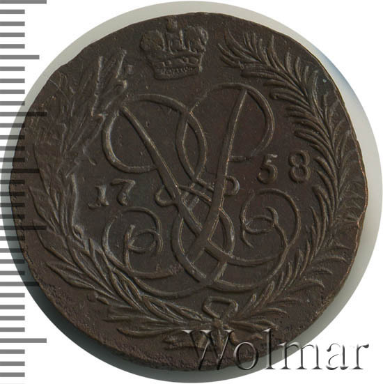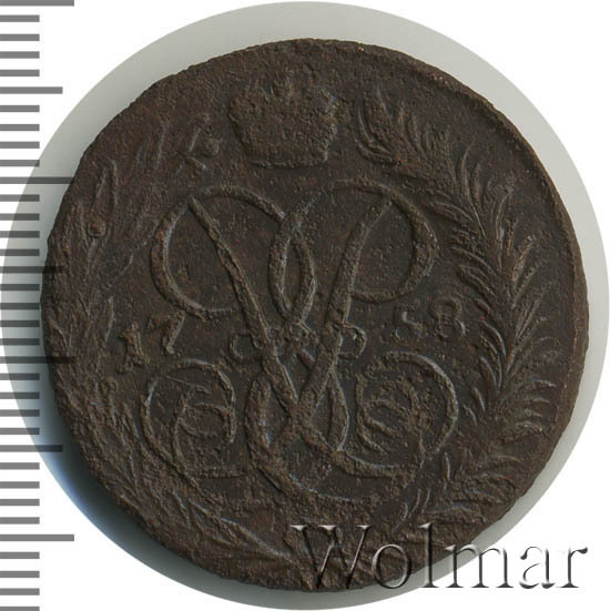 Эта старинная монетка 1758 года, относится к периоду правления императрицы Елизаветы Петровны (1741 – 1762 гг.). В тот год продолжалась перечеканка общегосударственной медной монеты по новому образцу и монетной стопе (16 рублей из пуда). Производство 2 коп. велось из 1 копейки предыдущего выпуска (1755 – 1757), по весу, аналогичному массе новых двухкопеечных монет. В основном, перечекан из облачных копеек (см. фото), производился на СПМД, Сестрорецком и Московском (Красном) мон. дворах.