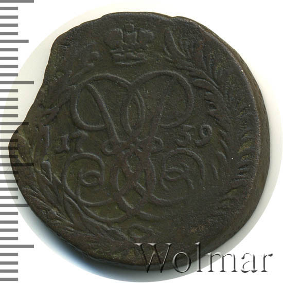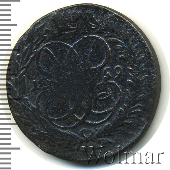 В центре изображён вензель императрицы Елизаветы I (Петровны). Над вензелем - императорская корона. По обеим сторонам от вензеля цифры даты выпуска монеты: слева - «17», справа - «59» (1759 год). Вокруг центрального изображения, вдоль канта, изображён венок из лавровой и пальмовой ветвей, которые, в нижней части, перевязаны лентой на узел бантом.