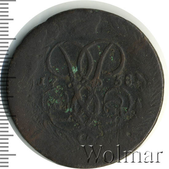 В центре изображён вензель императрицы Елизаветы I (Петровны). Над вензелем - императорская корона. По обеим сторонам от вензеля цифры даты выпуска монеты: слева - «17», справа - «58» (1758 год). Вокруг центрального изображения, вдоль канта, изображён венок из лавровой и пальмовой ветвей, которые, в нижней части, перевязаны лентой на узел бантом.