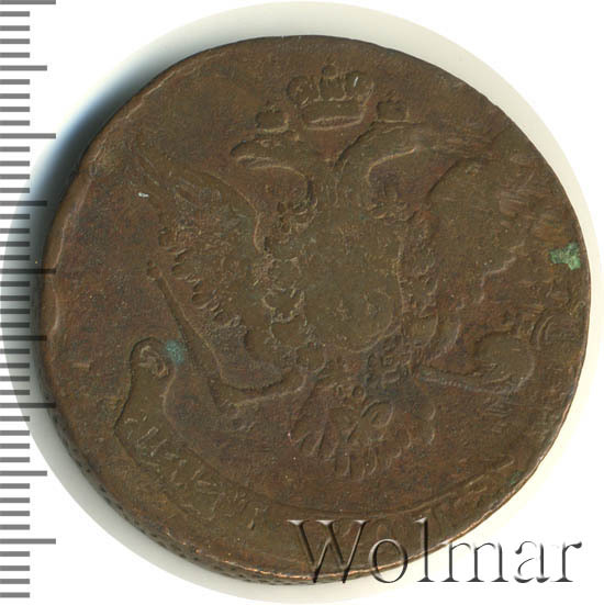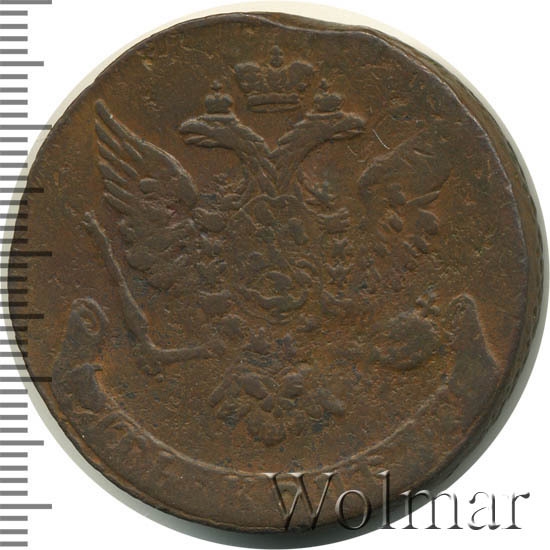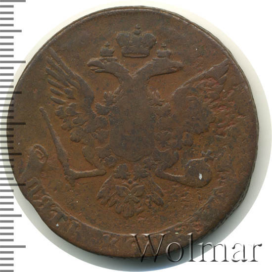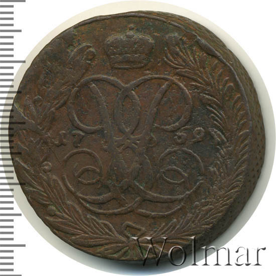 Номинал 5 копеек чеканился не самого начала правления Императрицы Российского государства Елизаветы Петровны (1741 – 1961). Производство началось в 1757 году и, монеты этого типа, чеканили даже после её смерти вплоть до 1762 г. включительно. Данная 5 коп. (без обозначения МД) выпускалась на Екатеринбургском (см. фото), Сестрорецком, Санкт - Петербургском и Красном монетных дворах. Также есть 5 коп. 1759 ММ (Красный м.д., располагался в г. Москве, дороже в 2 раза обычной).
