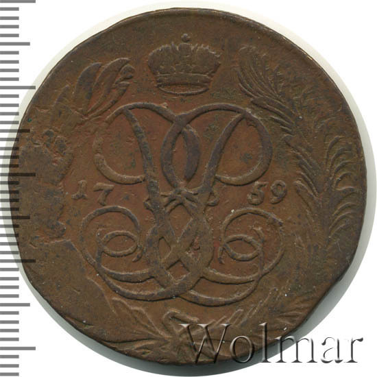 Расположение аверса к реверсу – медальное (0 градусов). Цена 5 копеек 1759 года, без обозначения монетного двора, сильно зависит от коллекционного состояния, для монет в отличной сохранности (штемпельный блеск, без потёртостей – следов пребывания в денежном обороте), может возрасти в десять и более раз. Подробно ознакомиться с ценой пяти копеек 1759 года, Вы можете во вкладке «стоимость монеты», а так же принять участие в текущих аукционах, пройдя по вкладке «активные лоты».