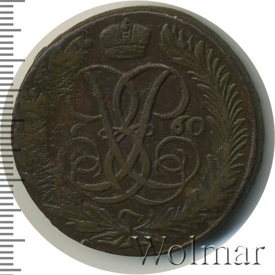 В центре изображён вензель императрицы Елизаветы I (Петровны). Над вензелем - императорская корона. По обеим сторонам от вензеля цифры даты выпуска монеты: слева - «17», справа - «60» (1760 год). Вокруг центрального изображения, вдоль канта, изображён венок из лавровой и пальмовой ветвей, которые, в нижней части, перевязаны лентой на узел бантом.