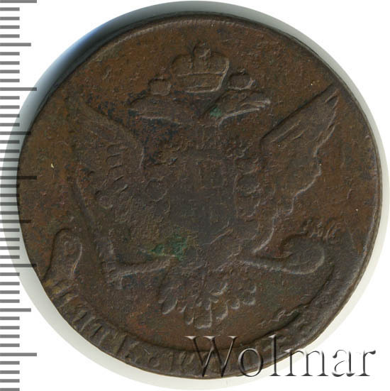Выпуск монет в 5 копеек производился из расчёта 16 рублей из пуда меди. Монеты чеканились без обозначения монетного двора, лишь крайне небольшой тираж на Красном мон. дворе вышел с буквами "ММ" под лапами имперского орла, изображенным на аверсе. Эти монеты дороги и имеют степень редкости Р1.
