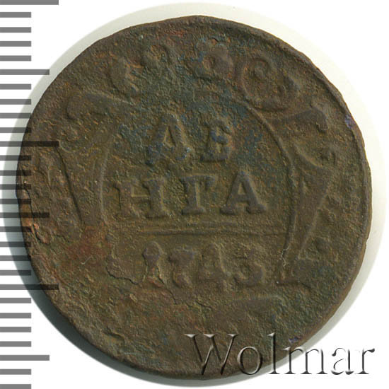 В центре изображён картуш украшенный виньетками, по обеим сторонам две лавровые ветви, сверху - цветочная розетка. Под картушем - две перекрещенные пальмовые ветви. В картуше надпись в три строки, в которой указан номинал и год выпуска: «ДЕ»│«НГА»│«1743». Между номиналом и годом выпуска две прямые черты.