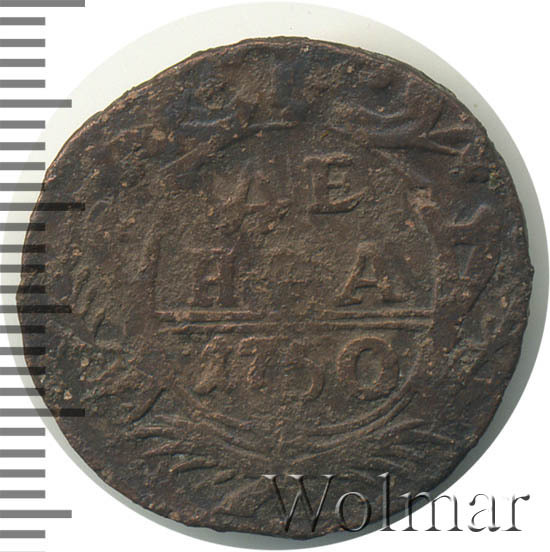 В центре изображён картуш украшенный виньетками, по обеим сторонам две лавровые ветви, сверху - цветочная розетка. Под картушем - две перекрещенные пальмовые ветви. В картуше надпись в три строки, в которой указан номинал и год выпуска: «ДЕ»│«НГА»│«1750». Между номиналом и годом выпуска две прямые черты.