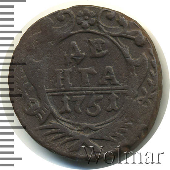 Рядовая разменная монетка, относящаяся к годам правления императрицы Елизаветы Петровны (1741 – 1761). Чеканка денги 1751 года велась на Московском Красном и Екатеринбургском монетных дворах. Тип оставался неизменным с 1730 года, менялось только дата и незначительные детали изображение имперского орла на аверсе.