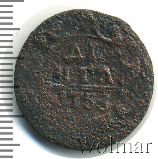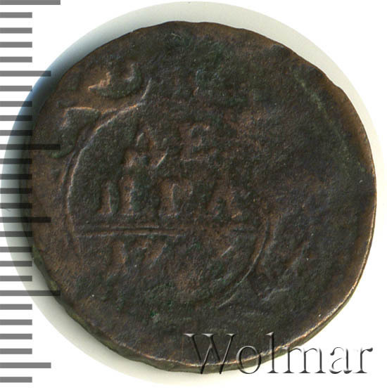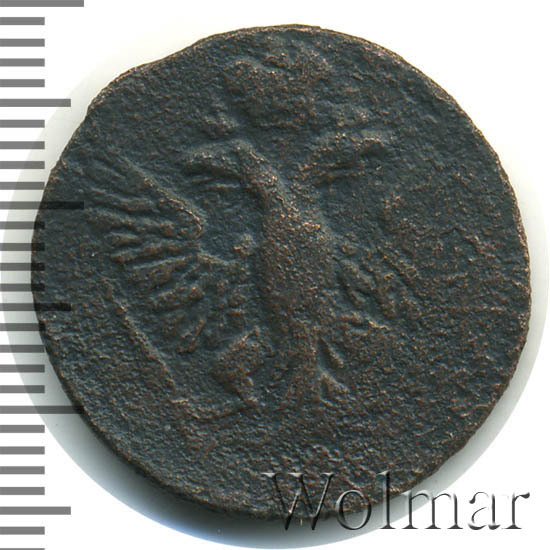 Часто встречающаяся денга, времён царствования Императрицы Елизаветы Петровны (1741 – 1761). Такой тип чеканился, с не большими изменениями в рисунке, с 1730 года. Имеет две значительные разновидности: денга с государственным орлом, образца 1748 г., в два раза дороже с орлом 1753- 54 гг. (на фото). 10 рублёвая стопа. Соостность (расположение аверса к реверсу) – 0 градусов (медальная). Чеканилась на двух монетных дворах: Екатеринбургском и Московском Красном. Определить принадлежность конкретного экземпляра денги 1753 г. к определённому мон. двору проблематично, так как штемпеля для производства монеты, постоянно перевозились от одного двора к другому.