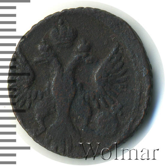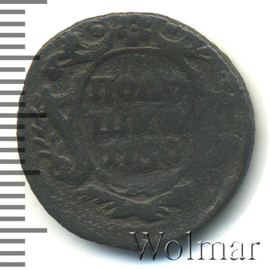 В центре изображён картуш украшенный виньетками, по обеим сторонам две лавровые ветви, сверху - цветочная розетка. Под картушем - две перекрещенные пальмовые ветви. В картуше надпись в три строки, в которой указан номинал и год выпуска: «ПОЛУ»│«ШКА»│«1750».