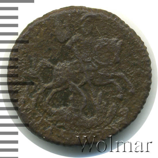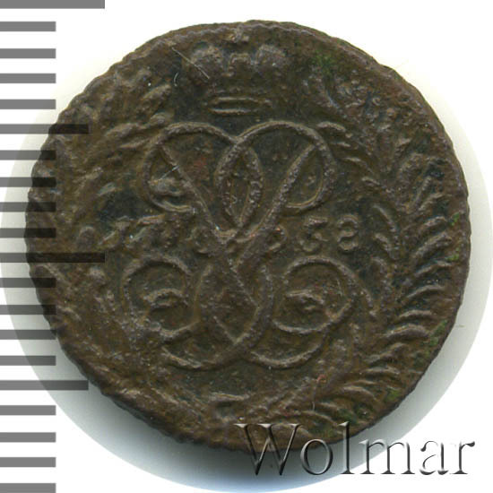 В центре изображён вензель императрицы Елизаветы I (Петровны). Над вензелем - императорская корона. По обеим сторонам от вензеля цифры даты выпуска монеты: слева - «17», справа - «58» (1758 год). Вокруг центрального изображения, вдоль канта, изображён венок из лавровой и пальмовой ветвей, которые, в нижней части, перевязаны лентой на узел бантом.