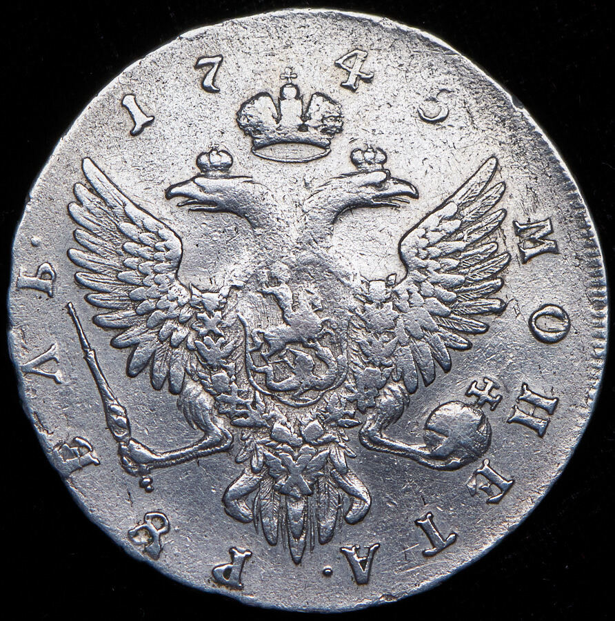 В центре изображен Государственный Герб Российской империи - двуглавый орёл, головы которого увенчаны двумя коронами, третья, большая корона над ними. На груди орла расположен Московский герб - щит с изображением Георгия Победоносца, поражающего копьём дракона. Вокруг щита орденская цепь с орденом Св. апостола Андрея Первозванного. В правой лапе орла скипетр, в левой – держава. Над орлом дата выпуска монеты – «1745». Вокруг орла, обращенная внутрь, надпись: «МОНЕТА•РУБЛЬ•».