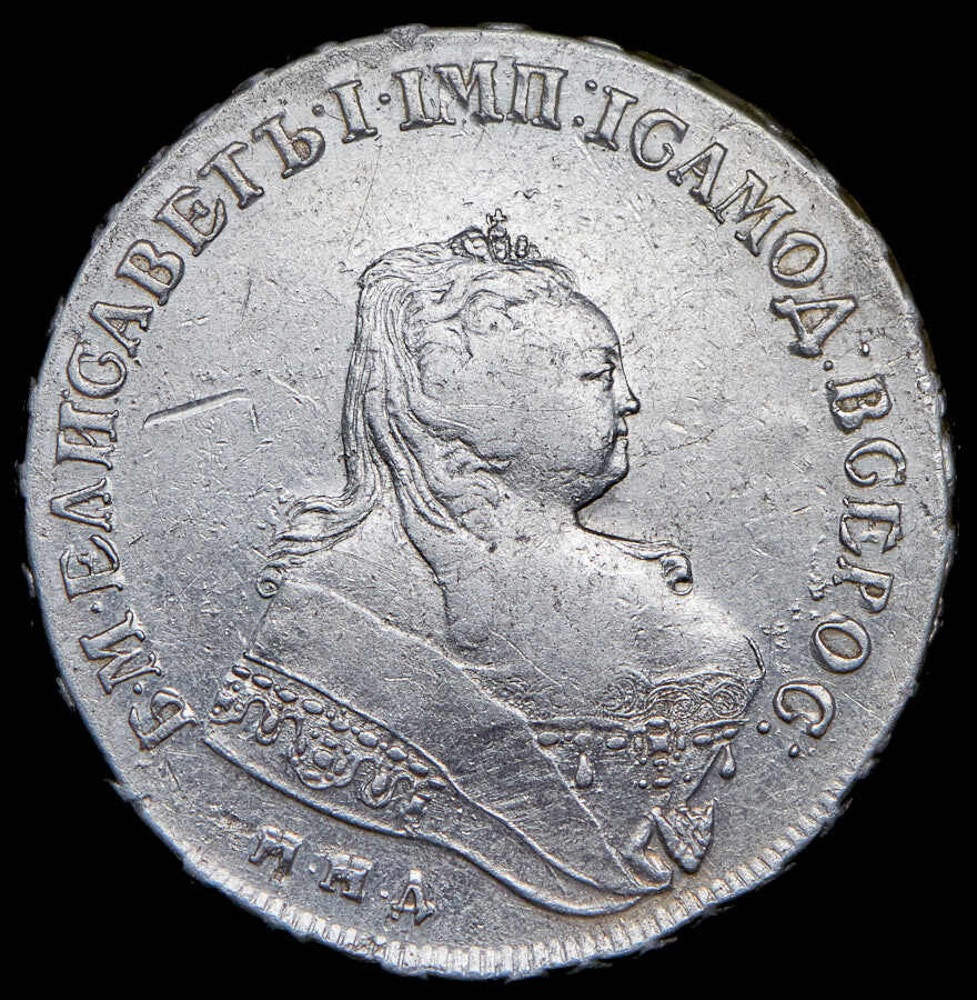 В центре профильный портрет вправо императрицы Елизаветы I (Петровны). Вокруг портрета круговая надпись: «Б•М•ЕЛИСАВЕТЪ•I•IМП: IСАМОД: ВСЕРОС:». Под портретом буквы «М М Д» - обозначение московского Красного монетного двора.