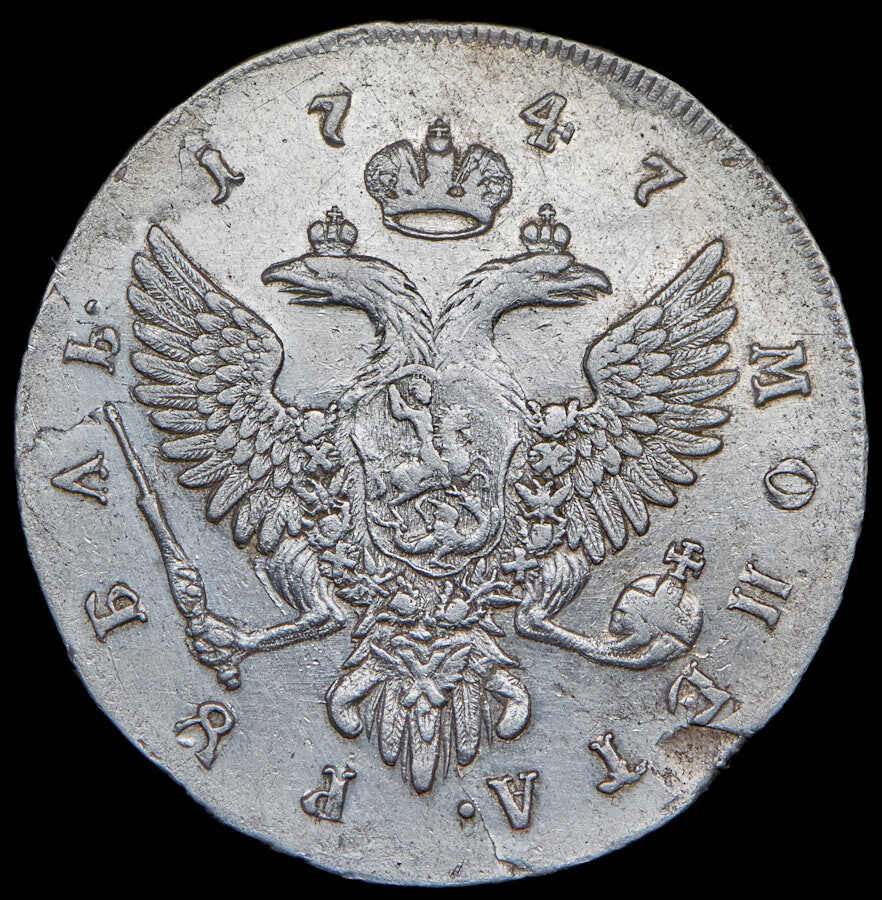 В центре изображен Государственный Герб Российской империи - двуглавый орёл, головы которого увенчаны двумя коронами, третья, большая корона над ними. На груди орла расположен Московский герб - щит с изображением Георгия Победоносца, поражающего копьём дракона. Вокруг щита орденская цепь с орденом Св. апостола Андрея Первозванного. В правой лапе орла скипетр, в левой – держава. Над орлом дата выпуска монеты – «1747». Вокруг орла, обращенная внутрь, надпись: «МОНЕТА•РУБЛЬ•».