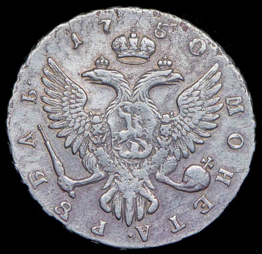 В центре изображен Государственный Герб Российской империи - двуглавый орёл, головы которого увенчаны двумя коронами, третья, большая корона над ними. На груди орла расположен Московский герб - щит с изображением Георгия Победоносца, поражающего копьём дракона. Вокруг щита орденская цепь с орденом Св. апостола Андрея Первозванного. В правой лапе орла скипетр, в левой – держава. Над орлом дата выпуска монеты – «1750». Вокруг орла, обращенная внутрь, надпись: «МОНЕТА•РУБЛЬ•».