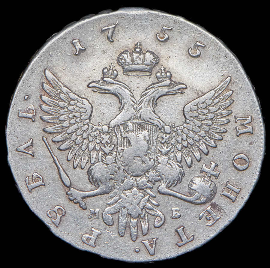 В центре изображен Государственный Герб Российской империи - двуглавый орёл, головы которого увенчаны двумя коронами, третья, большая корона над ними. На груди орла расположен Московский герб - щит с изображением Георгия Победоносца, поражающего копьём дракона. Вокруг щита орденская цепь с орденом Св. апостола Андрея Первозванного. В правой лапе орла скипетр, в левой – держава. Под правой лапой – буква «М», под левой – буква «Б». Инициалы минцмейстера Михаила Бобровшикова. Над орлом дата выпуска монеты – «1755». Вокруг орла, обращенная внутрь, надпись: «МОНЕТА•РУБЛЬ•».