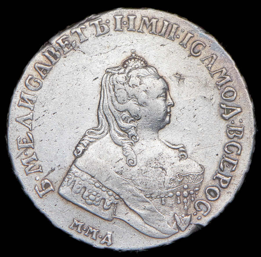 В центре профильный портрет вправо императрицы Елизаветы I (Петровны). Вокруг портрета круговая надпись: «Б•М•ЕЛИСАВЕТЪ•I•IМП: IСАМОД: ВСЕРОС•». Под портретом буквы «М М Д» - обозначение московского Красного монетного двора.