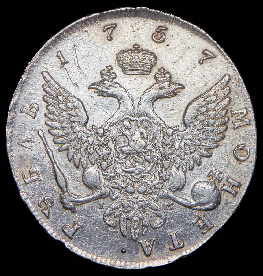 В центре изображен Государственный Герб Российской империи - двуглавый орёл, головы которого увенчаны двумя коронами, третья, большая корона над ними. На груди орла расположен Московский герб - щит с изображением Георгия Победоносца, поражающего копьём дракона. Вокруг щита орденская цепь с орденом Св. апостола Андрея Первозванного. В правой лапе орла скипетр, в левой – держава. Под правой лапой – буква «I», под левой – буква «М». Инициалы минцмейстера Ивана Маркова. Над орлом дата выпуска монеты – «1757». Вокруг орла, обращенная внутрь, надпись: «МОНЕТА•РУБЛЬ•».