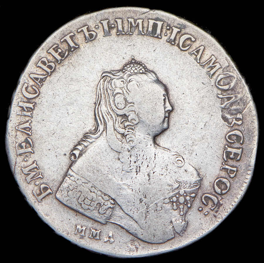 В центре профильный портрет вправо императрицы Елизаветы I (Петровны). Вокруг портрета круговая надпись: «Б•М•ЕЛИСАВЕТЪ•I•IМП: IСАМОД: ВСЕРОС•». Под портретом буквы «М М Д» - обозначение московского Красного монетного двора.