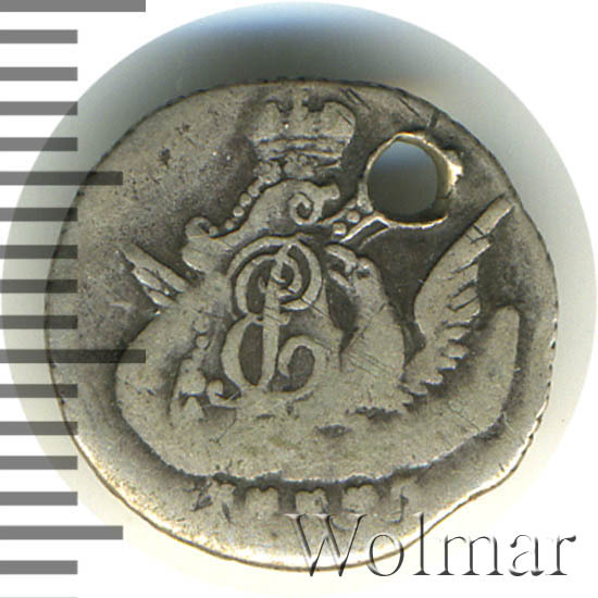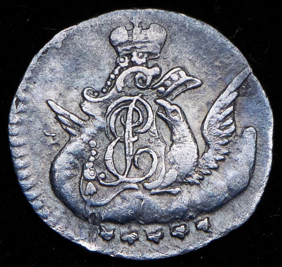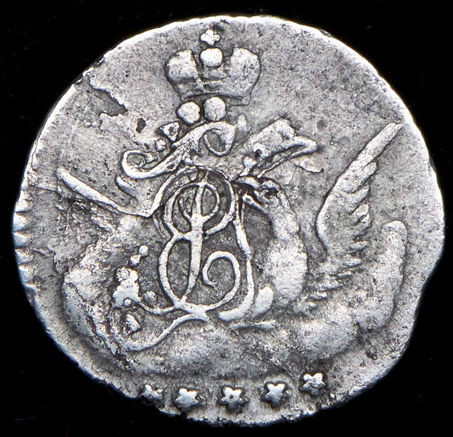 В центре изображён орёл с расправленными крыльями, сидящий на облаке и держащий в своём клюве картуш с вензелем императрицы Елизаветы I (Петровны). Изображение увенчано императорской короной. Под центральным изображением пять выпуклых счётных элементов, выполненных в виде звёзд. Звёзды обозначают (дублируют) номинал монеты.