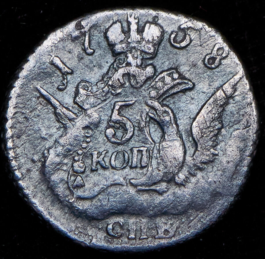 В центре изображён орёл с расправленными крыльями, сидящий на облаке и держащий в своём клюве картуш с надписью в две строки: «5»│«КОП». Изображение увенчано императорской короной. Под центральным изображением - буквы «СПБ», обозначение Санкт-Петербургского монетного двора. Над центральным изображением, разделённая короной, дата выпуска монеты – «1758».