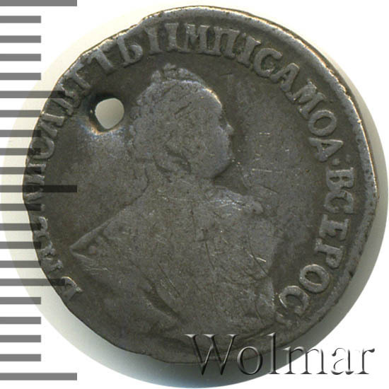 В центре профильный портрет вправо императрицы Елизаветы I (Петровны). Вокруг портрета круговая надпись: «Б•М•ЕЛИСАВЕТЪ•I•IМП: IСАМОД: ВСЕРОС».