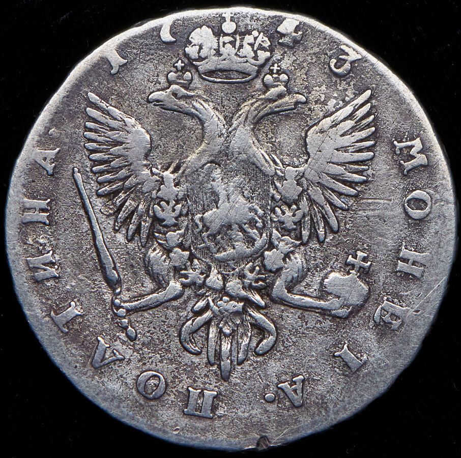 В центре изображен Государственный Герб Российской империи - двуглавый орёл, головы которого увенчаны двумя коронами, третья, большая корона над ними. На груди орла расположен Московский герб - щит с изображением Георгия Победоносца, поражающего копьём дракона. Вокруг щита орденская цепь с орденом Св. апостола Андрея Первозванного. В правой лапе орла скипетр, в левой – держава. Над орлом дата выпуска монеты – «1743». Вокруг орла, обращенная внутрь, надпись: «МОНЕТА•ПОЛТИНА•».