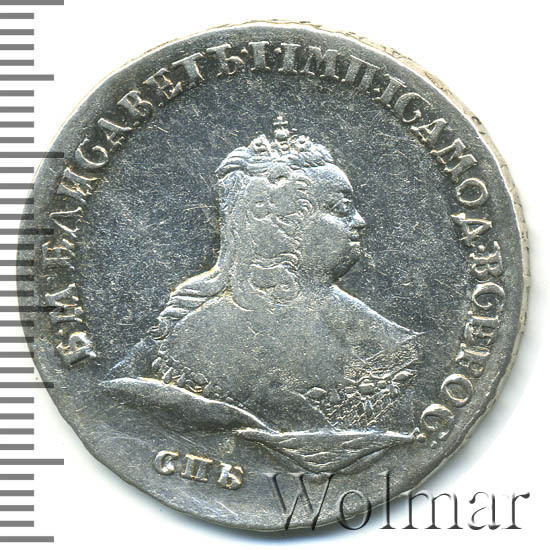 В центре профильный портрет вправо императрицы Елизаветы I (Петровны). Вокруг портрета круговая надпись: «Б•М•ЕЛИСАВЕТЪ•I•IМП: IСАМОД: ВСЕРОС:». Под портретом буквы «С П Б» - обозначение Санкт-Петербургского монетного двора.