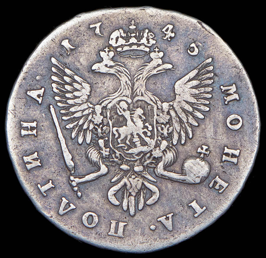 В центре изображен Государственный Герб Российской империи - двуглавый орёл, головы которого увенчаны двумя коронами, третья, большая корона над ними. На груди орла расположен Московский герб - щит с изображением Георгия Победоносца, поражающего копьём дракона. Вокруг щита орденская цепь с орденом Св. апостола Андрея Первозванного. В правой лапе орла скипетр, в левой – держава. Над орлом дата выпуска монеты – «1745». Вокруг орла, обращенная внутрь, надпись: «МОНЕТА•ПОЛТИНА•».