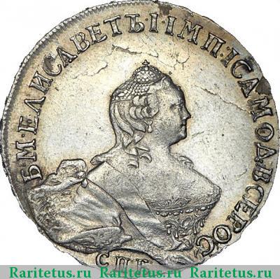 В центре профильный портрет вправо императрицы Елизаветы I (Петровны). Вокруг портрета круговая надпись: «Б•М•ЕЛИСАВЕТЪ•I•IМП: IСАМОД: ВСЕРОС». В обрезе рукава — буквы «B.S.», инициалы медальера Бенджамина Скотта. Под портретом буквы «С П Б» - обозначение Санкт-Петербургского монетного двора.
