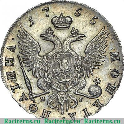В центре изображен Государственный Герб Российской империи - двуглавый орёл, головы которого увенчаны двумя коронами, третья, большая корона над ними. На груди орла расположен Московский герб - щит с изображением Георгия Победоносца, поражающего копьём дракона. Вокруг щита орденская цепь с орденом Св. апостола Андрея Первозванного. В правой лапе орла скипетр, в левой – держава. Под правой лапой – буква «Я», под левой – буква «I». Инициалы минцмейстера Якова Иванова. Над орлом дата выпуска монеты – «1755». Вокруг орла, обращенная внутрь, надпись: «МОНЕТА•ПОЛТИНА•».