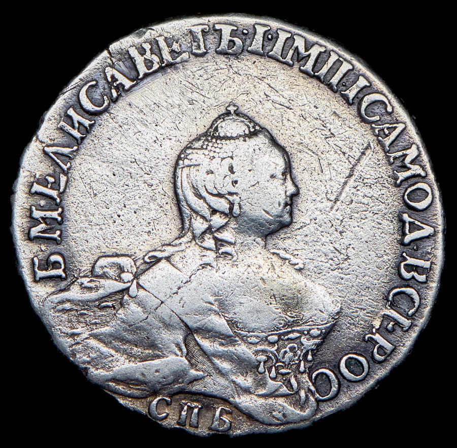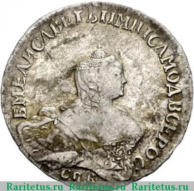 В центре профильный портрет вправо императрицы Елизаветы I (Петровны). Вокруг портрета круговая надпись: «Б•М•ЕЛИСАВЕТЪ•I•IМП•IСАМОД•ВСЕРОС». В обрезе рукава — буквы «B.S.», инициалы медальера Бенджамина Скотта. Под портретом буквы «С П Б» - обозначение Санкт-Петербургского монетного двора.
