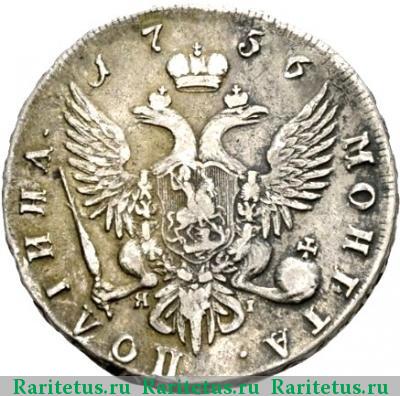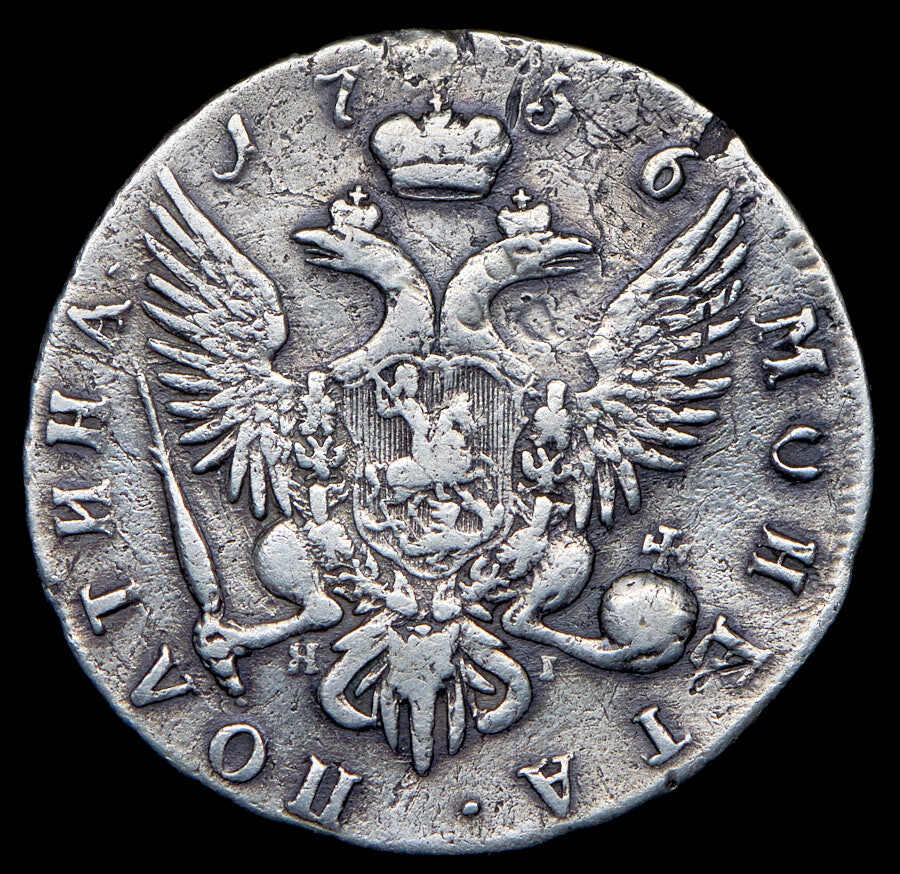 В центре изображен Государственный Герб Российской империи - двуглавый орёл, головы которого увенчаны двумя коронами, третья, большая корона над ними. На груди орла расположен Московский герб - щит с изображением Георгия Победоносца, поражающего копьём дракона. Вокруг щита орденская цепь с орденом Св. апостола Андрея Первозванного. В правой лапе орла скипетр, в левой – держава. Под правой лапой – буква «Я», под левой – буква «I». Инициалы минцмейстера Якова Иванова. Над орлом дата выпуска монеты – «1756». Вокруг орла, обращенная внутрь, надпись: «МОНЕТА•ПОЛТИНА•».