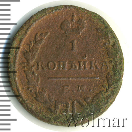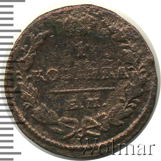 В центре указан номинал - цифра «1». Над цифрой - императорская корона. Под цифрой номинала — надпись «КОПЕЙКА». Под надписью - прямая черта, под ней - обозначение монетного двора «Е.М.». Вдоль канта, не доходя до короны, изображен венок из лавровой и дубовой ветви, которые в нижней части переплетены лентой. По окружности канта имеются рельефные элементы, выполненные в виде точек.